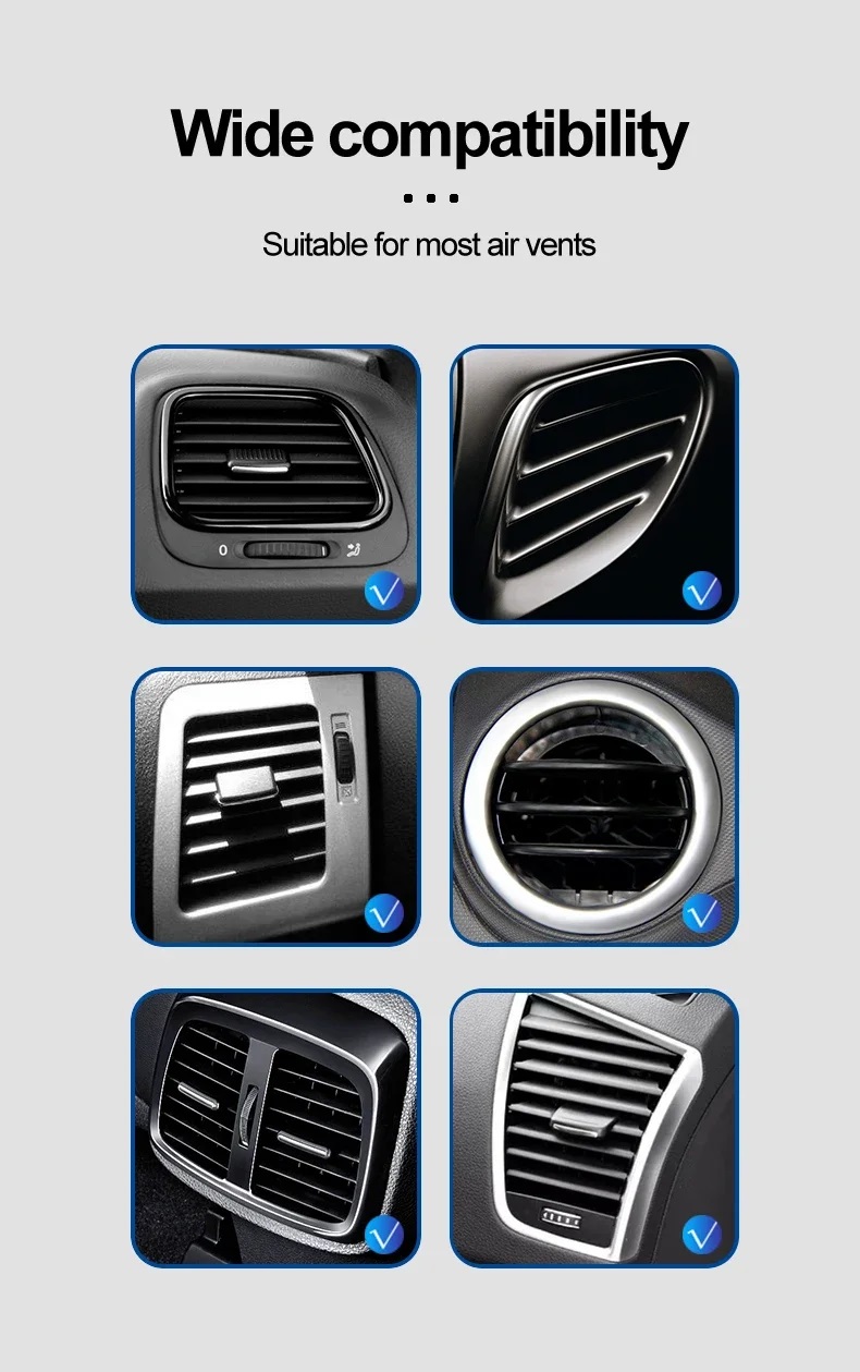 【Air Vent Mount】 Designed to fit most car air vents, this holder keeps your phone within easy reach and provides optimal viewing angles for navigation and hands-free calls.